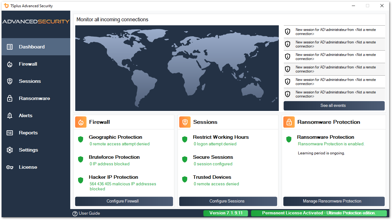 A barra de menu à esquerda fornece acesso aos diferentes recursos. Cada bloco oferece acesso às várias funcionalidades e configurações oferecidas pelo TSplus Advanced Security.