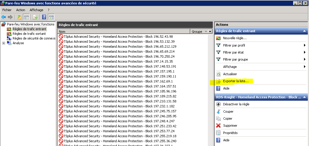 Windows firewall uses a rule named "TSplus Advanced Security - Homeland Access Protection- Block 94.232.47.130"