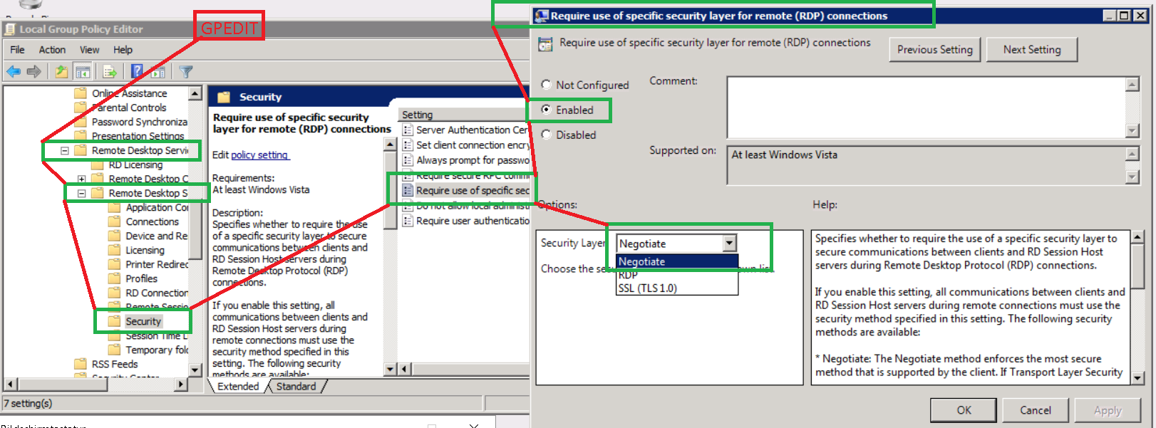 2. go to: Administrative Templates Windows > Components > Remote Desktop Services > Remote Desktop Session Host > Security > Require use of specific security layer for remote (RDP) connections > Enabled > Security Layer