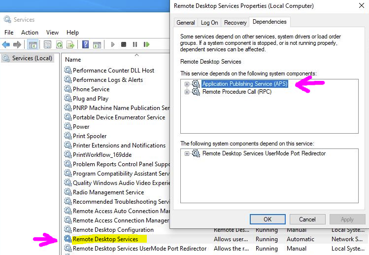 3 - Edit the parameters of the "Remote Desktop" service and check that there is APS in the dependency tab: