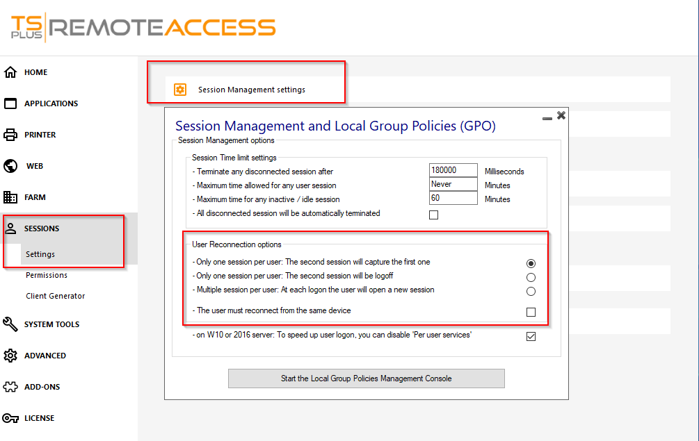 However for some reasons you might want to be able to remotely log off the connected user if someone tries to open a new session with the same account. This is possible by using Group Policy. Click on the start menu, and execute "gpedit.msc", or click on the Group Policies in the Admin Tool under "server administration tab" as shown above.