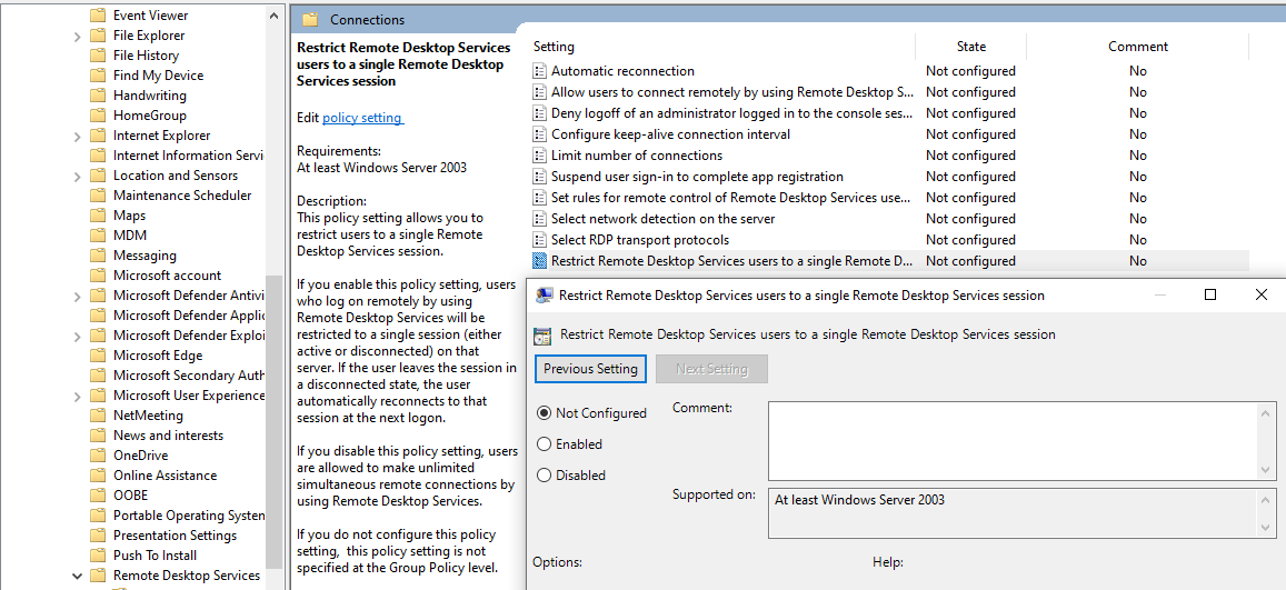 Computer Configuration\Administrative Templates\Windows Components\Remote Desktop Services\Remote Desktop Session Host\Connections\Restrict Remote Desktop Services users to a single Remote Desktop services session.