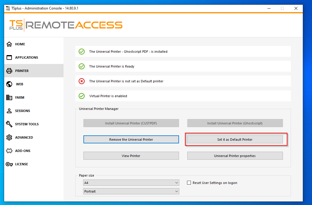 If your computers are part of an Active Directory Domain, you can also use Group Policy to set default printers. This functionality happens outside the TSplus Remote Access environment. Please see Microsoft technical document for more details.