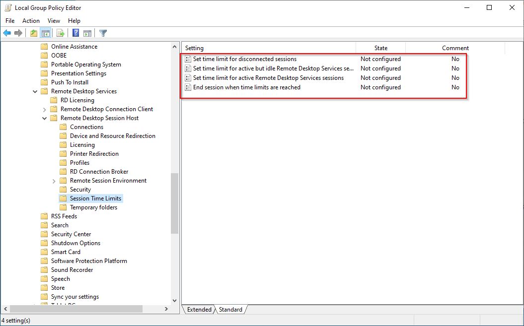 3- Set time limit for active Remote Desktop Services session - This strategy is used to force disconnection of active session, for example a user can remotely connect for a limited duration of 30mn then will be disconnected. This strategy is rarely used.