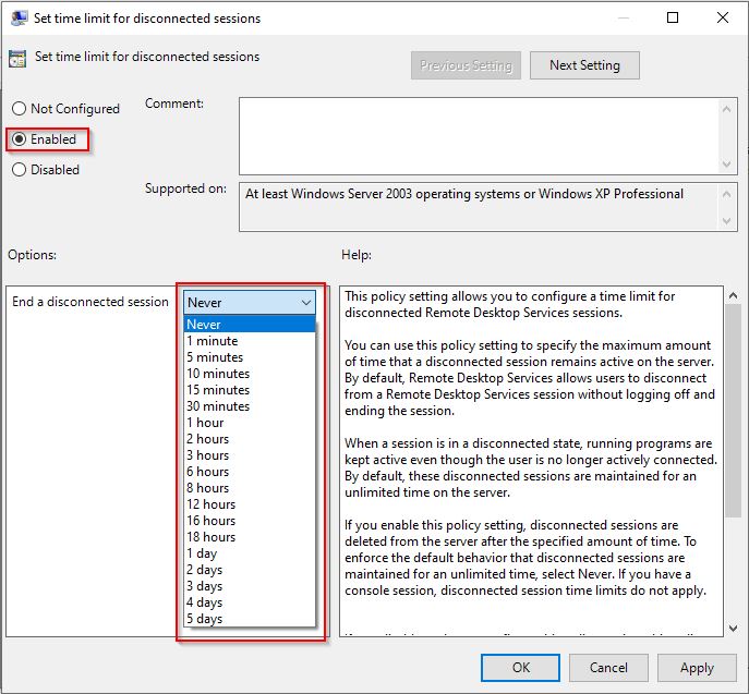 1- Set time for disconnected sessions - This strategy is used for logging off a disconnected session after a certain time. This can also be set in the Admin tool.