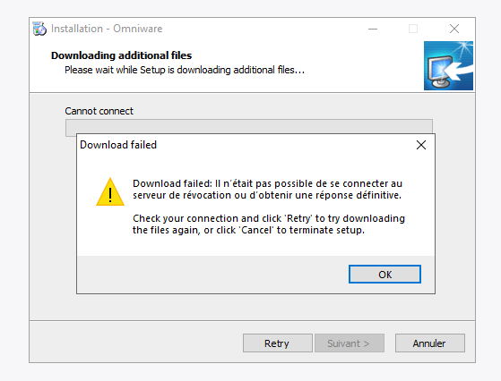 Check your connection and click 'Retry' to try downloading the files again, or click 'Cancel' to terminate setup.
