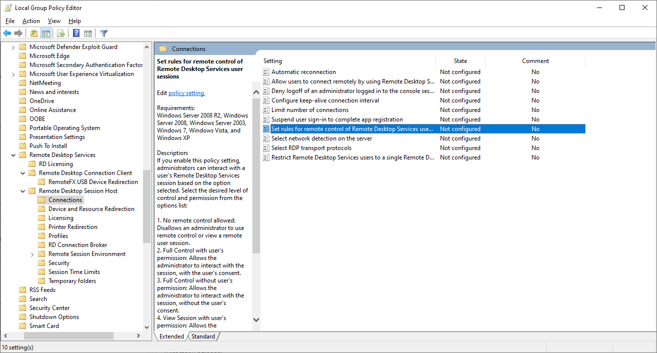 - Right-click Sets rules for remote control of Terminal Services user sessions, and then click Properties.