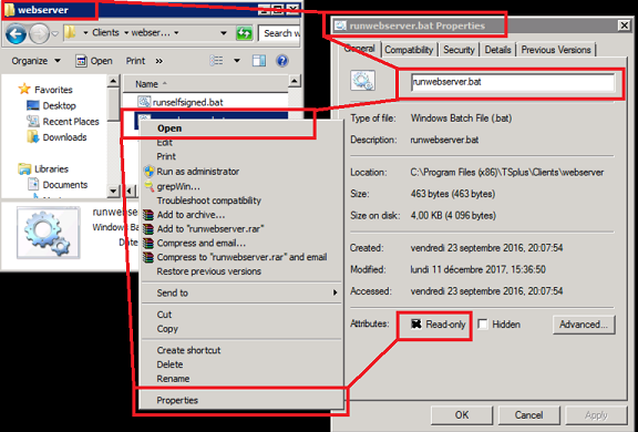 IMPORTANT NOTICE: when ever you change runwebserver.bat remember that AdminTool GUI automatically writes default settings in this file. To avoid that your settings get overwritten by TSplus AdminTool GUI set Read-only attribute on runwebserver.bat file!