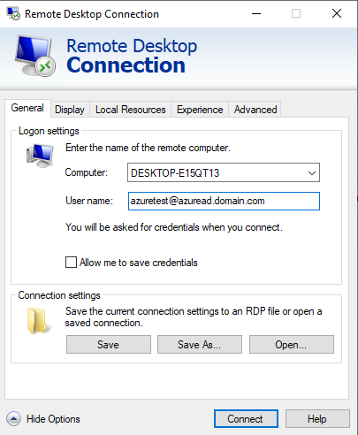 Note: the domain field is not the name of the local machine, but the name of the Azure Active Directory domain.