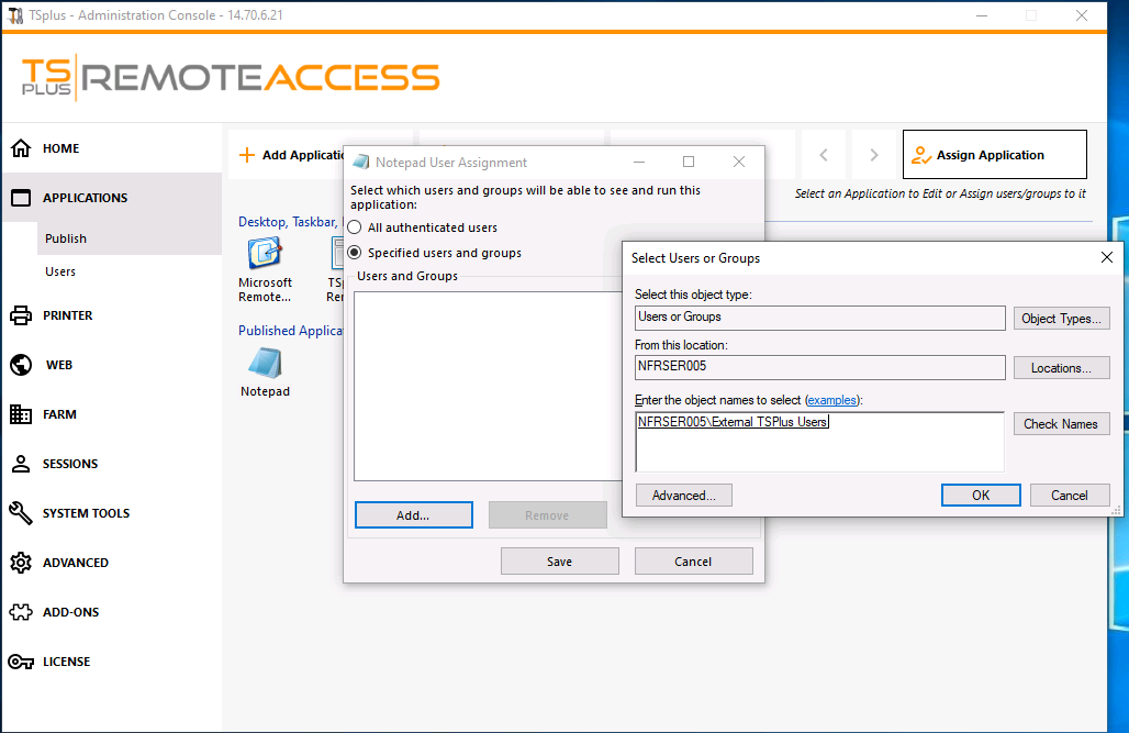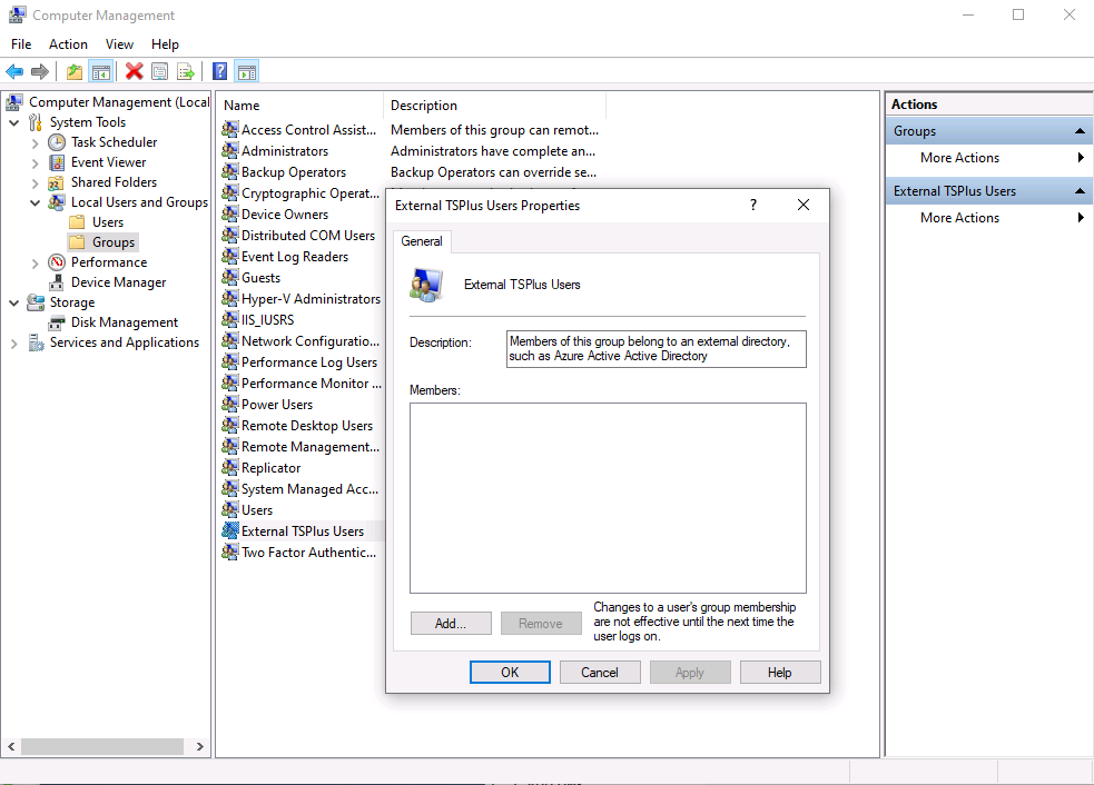 - External TSPlus User is the name of the local group previously created