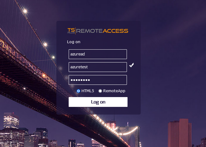 To be able to connect in HTML5 via the web portal, you must first add the Azure account to a group in your local AD on your TSPlus server and log in to the server with that account.