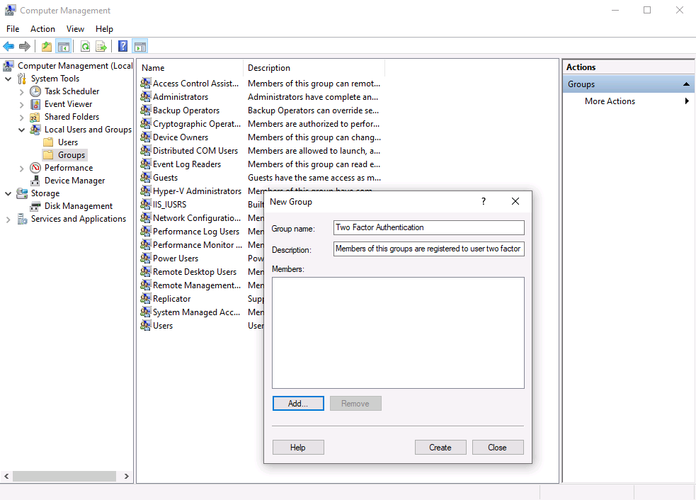 - Then, type a name, such as “Two Factor Authentication” and a short description, as shown below, and click on Create to create the local group.