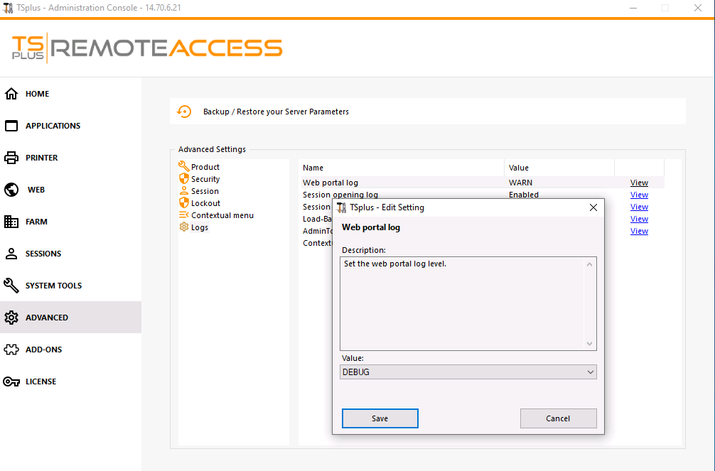 Please enable the DEBUG level for the Web portal Logs from AdminTool > Advanced > Logs, as show below: