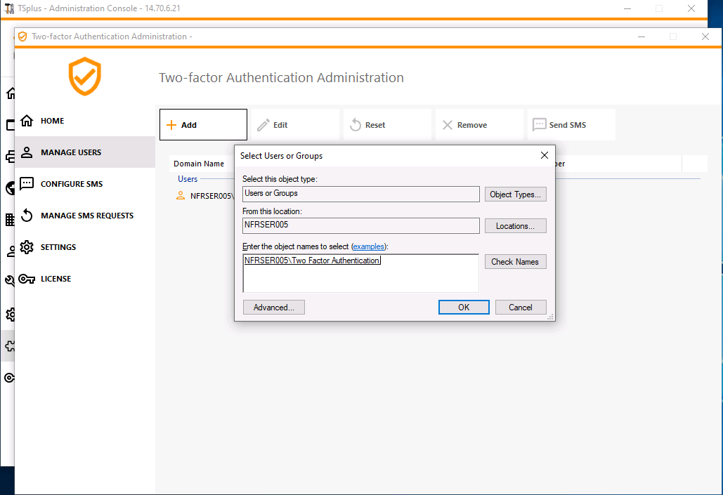 - From Manage Users, click on Add Groups to enable two-factor authentication for the local group previously created. A popup named “Select Users or Groups” opens.