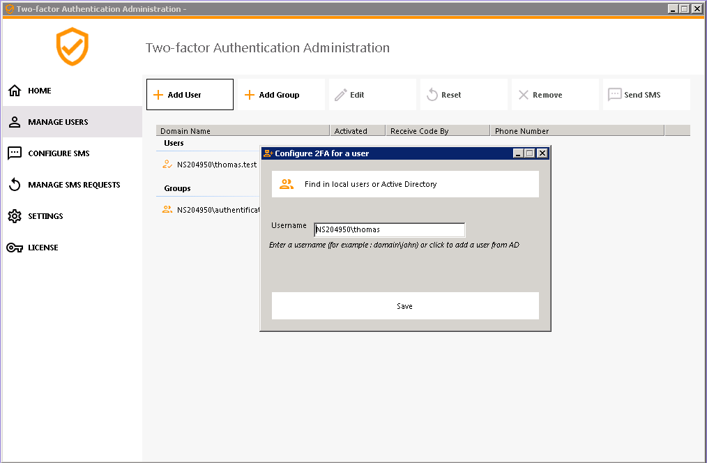 - From Manage Users, click on Add Users to enable two-factor authentication for the local group previously created. A popup opens.