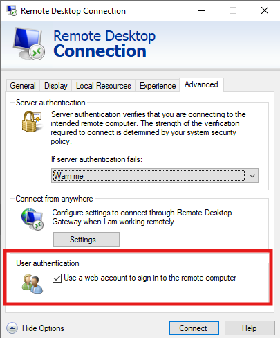 In the Advanced tab, you must tick the box ‘Use a web account to sign in to the remote computer’.