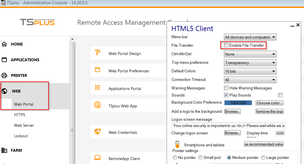 In the AdminTool, go to Web \ Web Portal \ HTML5 client and disable the File Transfer option.