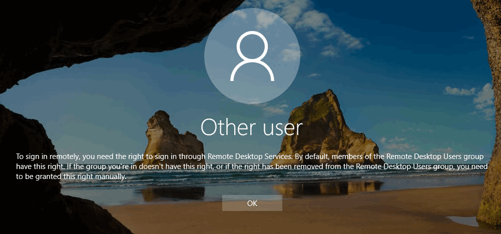 To sign in remotely, you need the right to sign in through Remote Desktop Services. By default, members of the Remote Desktop Users group have this right. If the group you’re in doesn’t have this right, or if the right has been removed from the Remote Desktop Users group, you need to be granted this right manually