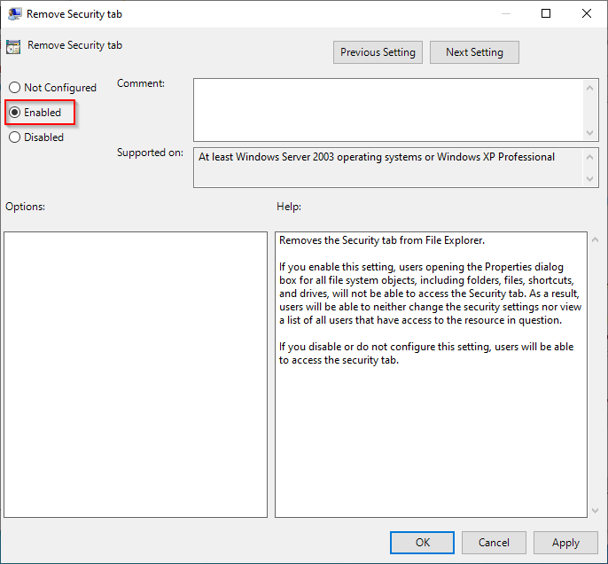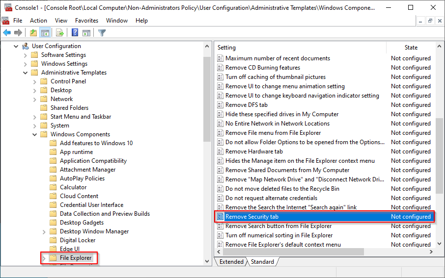 Locate and activate the following local GPO on your Remote Access server : User Configuration/Windows Components/File Explorer/Remove Security Tab