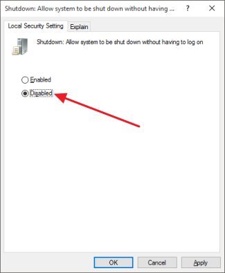 On the Local Security Setting tab, click Disabled and then click OK.