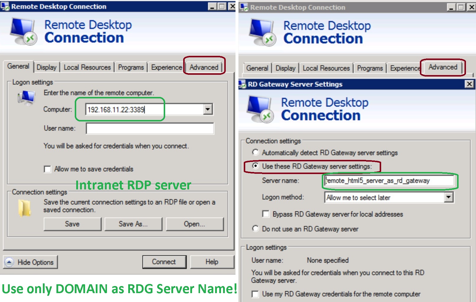1. insert wished target intranet RDP server as IP or as domain