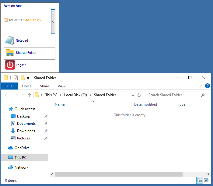 Here is the result, when you open a session with an RDP client, you will see the TSplus Remote Taskbar with the shared folder application: