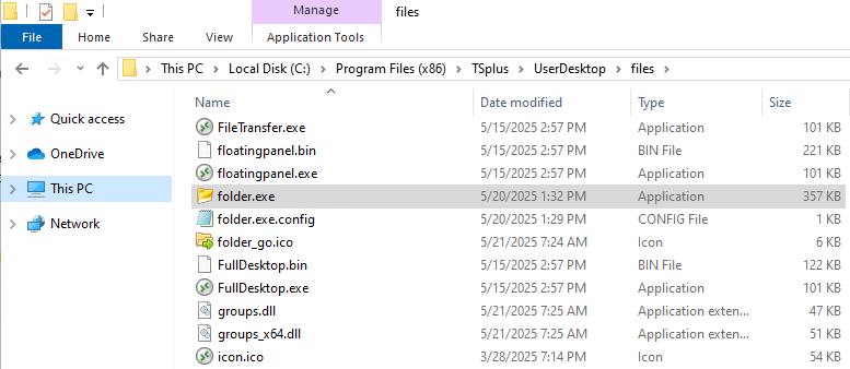 Open an explorer.exe and locate the folder.exe application in C:\Program Files\tsplus\UserDesktop\files: