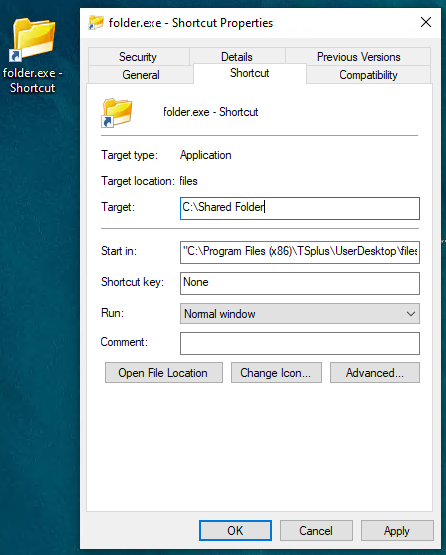 Then modify the target path of the shortcut by entering the path of your applications folder on the "Target" line, after the original target path, for example:"C:\Program Files\tsplus\UserDesktop\files\folder.exe" "C:\Shared Folder"