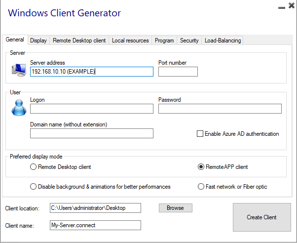 Double click on the Portable Client Generator and type in the local IP address of your new TSPlus server, with the name of your client then click on "Create Client"