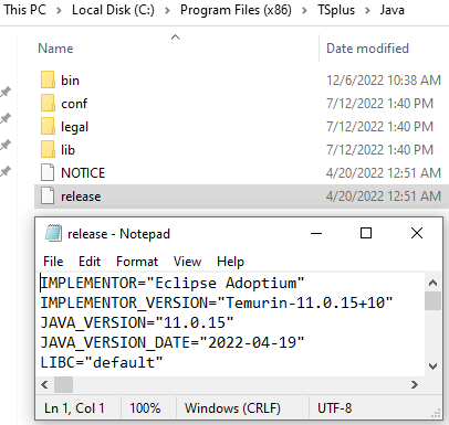 In command line with CMD, you can also navigate into the C:\Program Files (x86)\TSplus\Java folder and use the command "java --version" :