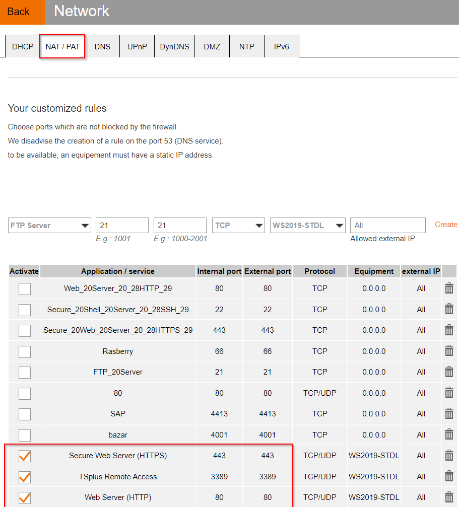 By default, web and TSplus traffic move in and out of a network on ports 80, 443 and 3389. For external access it is necessary to create rules in your router/firewall to allow traffic on those ports to enter the network and be directed to the proper server via internal (private) IP address. NOTE: It is important that your Remote Access server has a static private IP address.