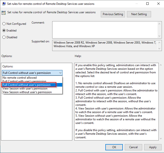 - Set the group policy to allow Remote Control without user consent.