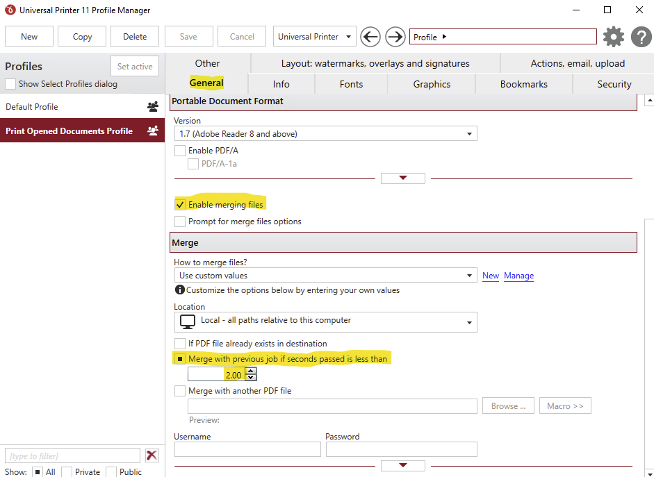 It is also necessary to verify that the merge options are properly enabled for this printing profile.